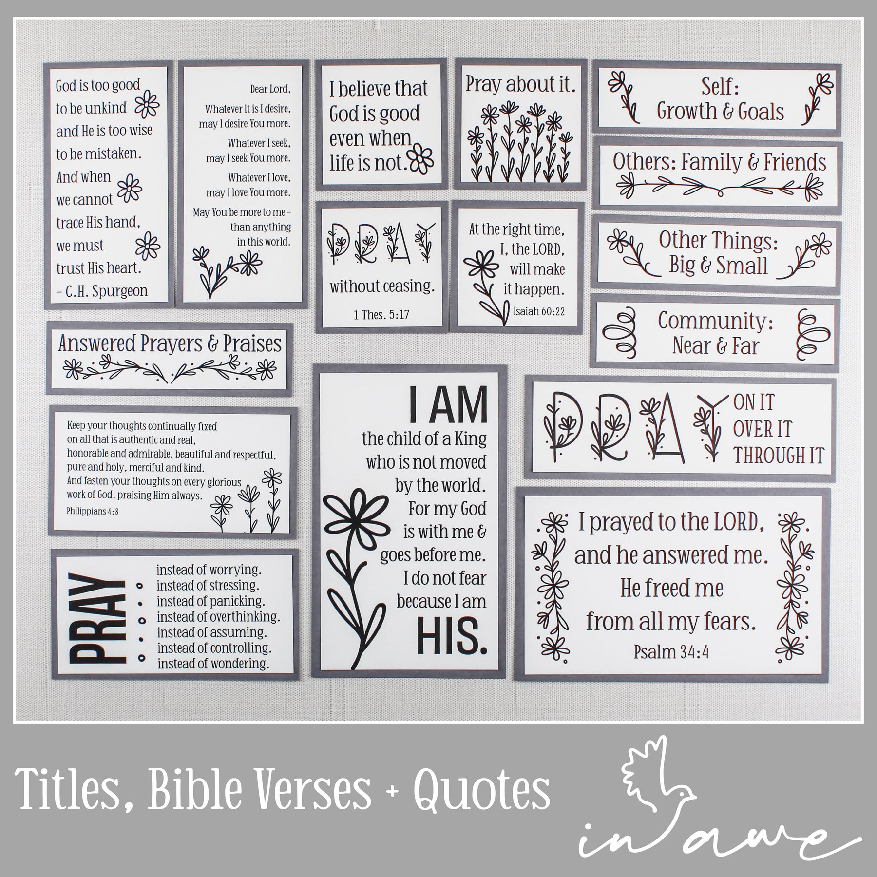 • 16 printed elements matted on cardstock – includes Bible verses, quotes, and envelope titles