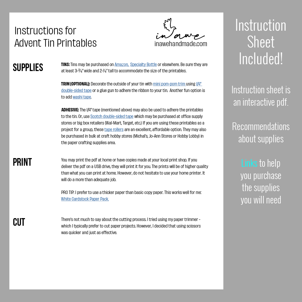 ⭐ Instruction sheet with printing and assembly tips and links to supplies